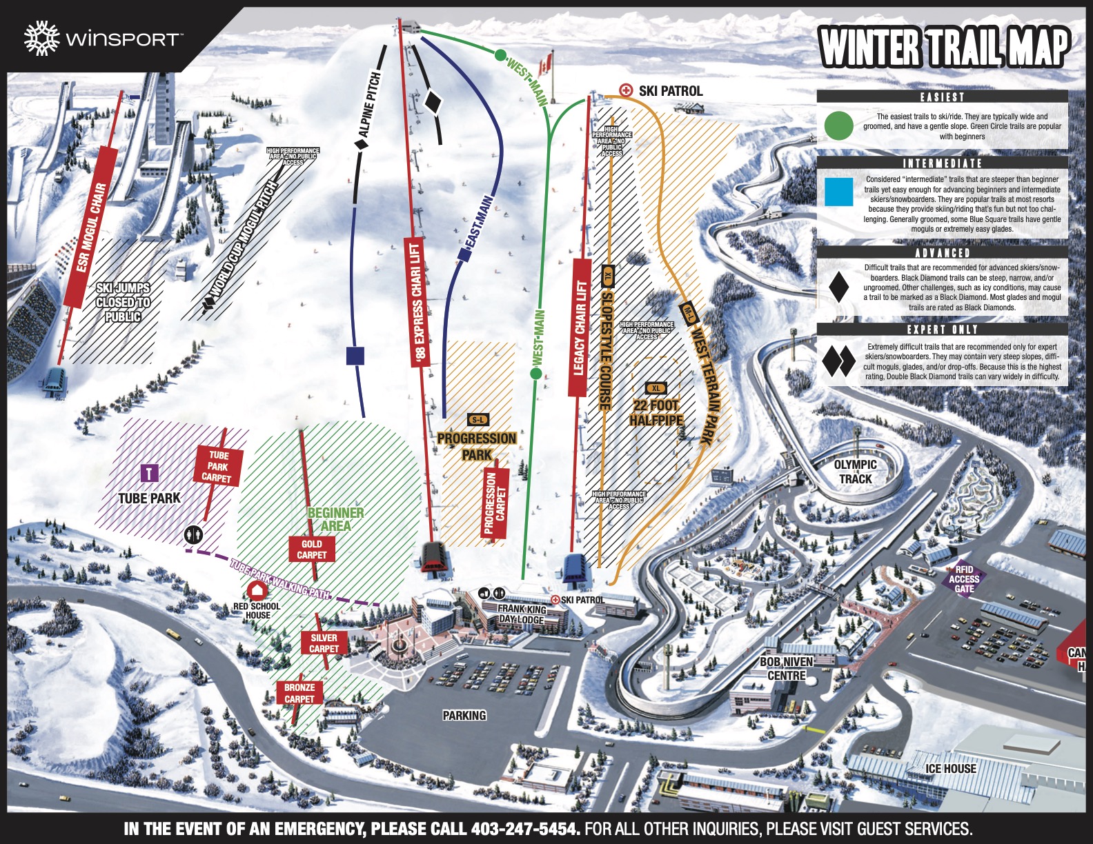 Skiing and snowboarding info for Winsport Olympic Park — see the weather forecast, snowfall reports, check out trail maps and get resort info, hours, directions and more.