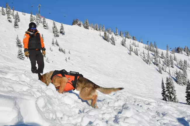 Hale who is lead patroller at the resort, as well as the Emergency Program Manager for the town of Golden and surrounding area, adds, “The reality is we don’t have a lot of avalanches where people are caught in them in Canada. But we do have a lot of avalanches that need to be checked. When an avalanche is called in and there are tracks leading into the debris, we use transceivers first. Then we bring the dogs in to sweep. I can send Gibson in for 20 minutes in a high-risk area instead of risking the lives of 20 people with probes for four hours.”