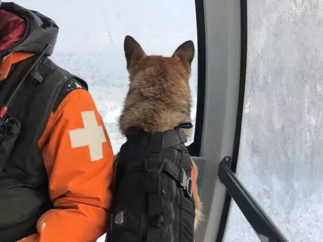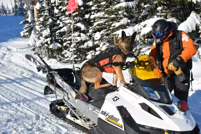 Avalanche dogs have to be comfortable riding snowmobiles, chairlifts and helicopters.