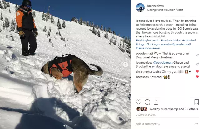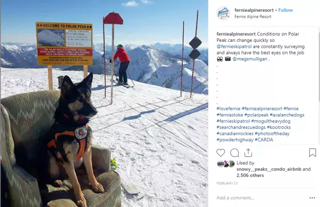 Nose down – butt up is what patrollers wants to see when their dog is searching for a buried skier. This is Gibson, posing for a story SnowSeekers did about avalanche dogs at Kicking Horse Mountain Resort. It was -20, we were all freezing, but she didn’t care. She was sprinting in the sunshine – oblivious to the chill and totally focused on finding that buried scent. Watching her maneuver through the snow showed it takes countless hours of effort from her and her handler. She did what she was trained to do and followed her nose to a successful recovery of a buried skier.